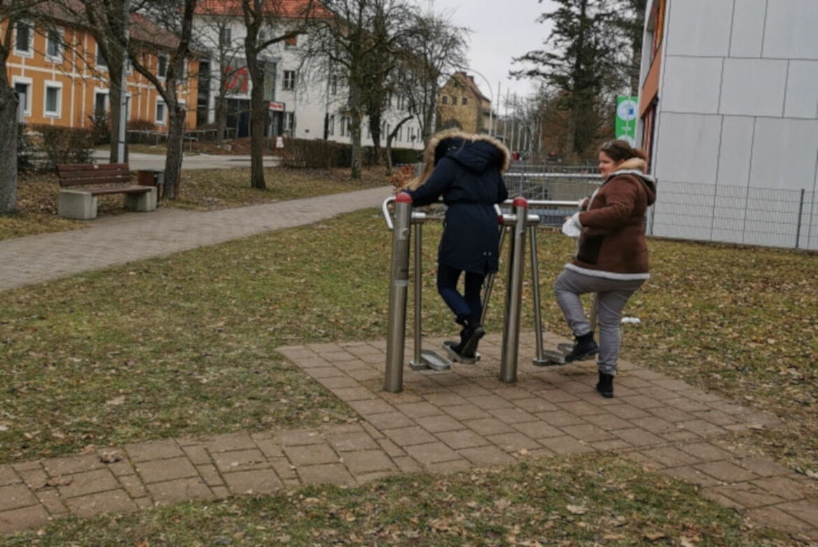 Im Pflegeunterricht ist zur Zeit Sebastian Kneipp im Mittelpunkt. Eine von den 5 Säulen ist die Bewegung. Dazu gab es gleich praktische Übungen am Bewegungs-Parcours vor der Dialog-Akademie.